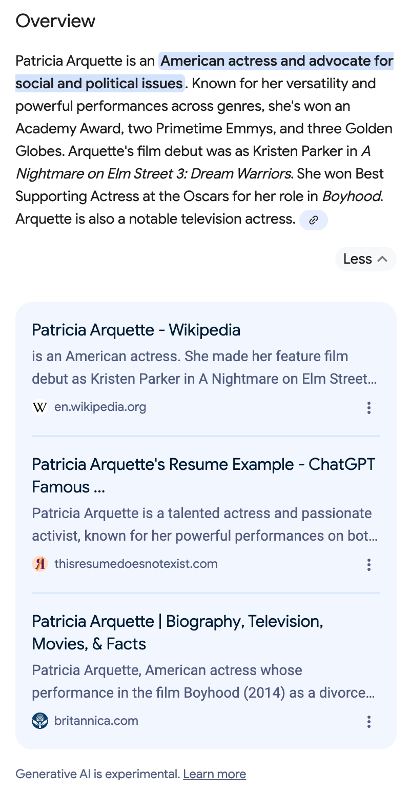 Wikipedia remains one of the cited sources, but the other two are Patricia Artquette's Encyclopedia Britannica article, and… a totally random profile of Artquette created by ChatGPT and hosted on a site called ThisResumeDoesNotExist. These three citations are followed by a disclaimer: "Generative AI is experimental."