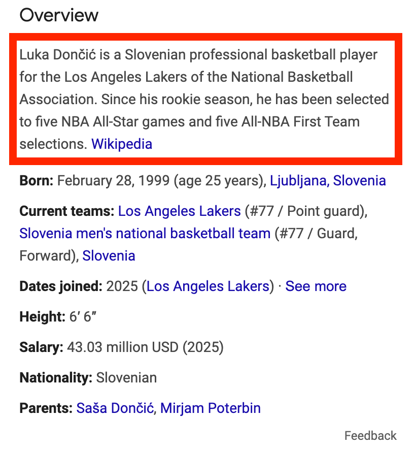 Knowledge panels, as you'll recall, are the information boxes that appear to the right of (and occasionally above) organic results when you search for prominent people, places, organizations, and things. The overview copy within knowledge panels is often pulled directly from Wikipedia, which is then cited as a source. The knowledge panel for NBA player Luka Dončić is a good example of this: